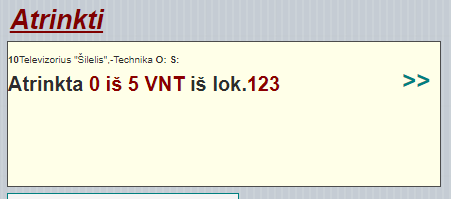 Kai reikia atrinkti prekes pagal sąrašą, gelsvame lauke rodomas sąrašas po vieną prekę, kurią reikia nuskenuoti. Rodyklių pagalba galima peršokti į kitą prekę. Skenuojant kitą prekę nei matosi ekrane, sistema automatiškai peršoka į ją.